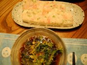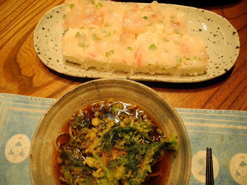 朝7時 3.9度 薄曇り(上松)。霜も降りてなくて、3度でも暖かく感じる嬉しい朝です。寒い場所に住んでると、寒い事に鈍感になる様ですが、10度を切った頃には「寒い」なんて言ってたけど、直ぐに馴染む様で、今では5度以下になっても風がない朝なんかは「暖かく」感じてます。写真は、4日目の誕生会です。おばさんに「何食べたいの?」と聞くと「押し寿司です」おじさんは「俺は駅蕎麦だな」と言う訳で、おじさんが押し寿司を作り、おばさんが春菊天駅蕎麦を作って誕生会です。駅蕎麦も一人前食べられないから、麺を半分ずつにして作って貰いました。麺を啜りながらのお寿司は、そん所其処らにない斬新なメニューでした(笑)。もう一枚は、真鯛の一夜干しです。沢山頂いた時はどんな魚でも一夜干しを作って居ますが、手間は掛かりますが、一夜干しは本当に美味しく食べられるのです。もう一品作ったのが、カマと中骨で出汁を取った後、身を外してソボロを作ります。是がおにぎりの具になって、いつ迄も鯛を楽しむ事が出来るのです。是で、おばさんの誕生会もお終いです(笑)。