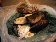 朝6時 +1.2度 曇り(上松)。黒雲が空を覆って、少し暖かな朝です。七日目で氷点下の朝を抜けられ、ちょっと嬉しい暖かな朝です。いま来てる低気圧が抜けると、再び氷点下になると思うけど、少しの間でも寒く感じない朝を楽しみたいものです。写真は、知多の鮮魚です。山さんが旗日の日に鮃釣りに乗船して坊主だったそうで、納得出来なくて堤防釣りに出掛け「ハゼ」「グレ(メジナ)」「メッキ(ロウニンアジ)」を釣り上げて送ってくれたのです。港の堤防でこんな種類の魚が釣れるなんて、木曽では到底考えられない事です。頂いていつも思う事は、釣り上げた魚を直ぐに血抜きをして、鮮度を保ってくれてる下処理なんです。この血抜きをしないと魚は「ぷり」が「ふにゃ」になってしまい、刺身では食べる事が出来ないのです。山さんは、ただ釣りが好きなだけではなく、食に対する拘りが強いから、木曽では絶対食べられない鮮度の高い魚を食べる事が出来るのです。本当に感謝です。もう一枚は、眉月です。少し雲の掛かった空に、眉月が沈んで行きました。今日からは曇りか雨の様で、次のお月見は「上弦の月」でしょうか?。