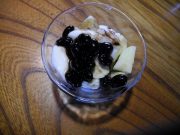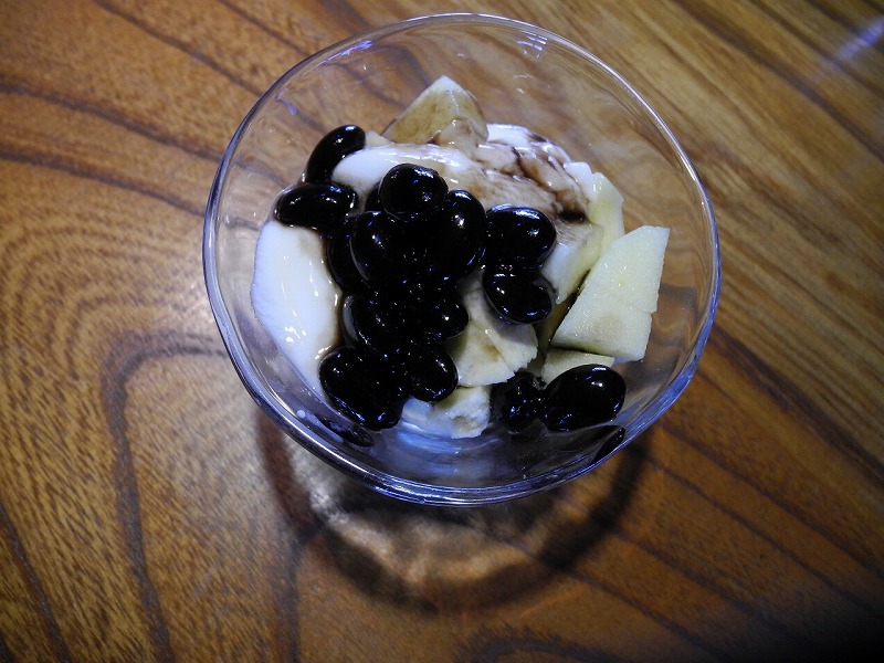朝6時 -8.83度 晴(上松)。晴れていて、「是でもか!」と言う位、冷え込んでる朝です。写真は、下弦の月です。霜が降りて空気も目茶苦茶に冷たい中、晴れた空に「ぽっかり」浮かんでる下弦の月です。上弦の月もいいけど、この下弦の月は深夜に登って来て、空が明るくなる頃輝かせてるのがいい感じで昼見るお月さんも良いものです。写真撮影で外に出たけど、まるで「冷凍庫の中」の様でした。もう一枚は、デザートです。「黒豆ヨーグルト」とおばさんが命名したデザートですが、是が美味しいのです。バナナと林檎の角切りにヨーグルトを掛けて、其処へ黒豆と煮汁を掛けたものです。黒豆の煮汁がたっぷり掛けて有るから、丁度いい酸味になって、もう少し大盛でも食べられるのですが、おばさんが「そんなことしたら直ぐ黒豆が終わっちゃうから」と小鉢で我慢させられています。昼食が楽しくなってます。