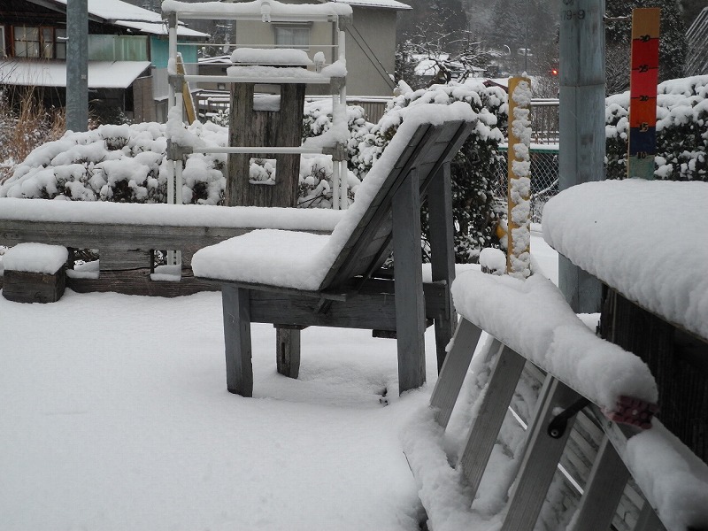 朝7時 -5.19度 小雪(上松)。細かい雪が「ひらひら」舞って居て、寒さは普通の冬の朝です。昨夜からの積雪量は6、7㎝で、流石に今日は雪掻きをしなくてはならない様です。写真は、昨日の昼間の雪降りです。NEWSでは「東京に雪が降った」と報道されてる時に木曽はこんな感じで「やったー勝ったぞ」なんて笑ってたけど、夜になってから強く降り出して、今朝のこの雪景色になってしまい「負けてしまった」なんです。軽い雪だから「雪跳ね」でも十分掻けそうで、雪掻き機のエンジンを掛けなくて済むかも知れません?。この雪で今まで出されてた「林野火災注意報」が解除された事は嬉しいけど、この先細心の注意をして「焚火や遊び」の野外での火の取り扱いには気を付けたいものです。草叢で車のエンジンの掛けっ放しで、草が焼けたなんてのも有るから、常に「自分に注意報」を出して置かないといけないのでしょう。今日は、先ずは雪掻きから始まりです(涙)。