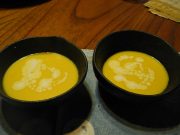 朝5時 10.9度 晴(上松)。「なんだこの寒さは!」一気に気温が下がった朝です。昨夜から寒かったけど、まさか一桁の一歩手前の10度とは。何でそんな事になってしまったのでしょう?。写真は、春菊です。芽吹いた頃は「是は早く食べられそう」なんて思たけど、最近成長が遅くなってしまい「いつ食べられる様になるのかな?」になっています。しかし今朝の様な気温になると、霜でも降りて枯れるかも知れません。保護用のビニールシートを購入しないといけないかも知れません。スーパーで購入して食べた方が、安いかも?です。もう一枚は、カボチャスープです。「美味しいでしょ」と言うから「生温かい」と返すと「氷入れて上げる」と冷やして飲んだけど、やっぱし作ったものの美味しさは、味に重みがある様です。鍋に沢山作って有ったから当分楽しめそうです。